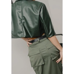 Size S Bust : 102cm Shoulder : 40 Sleeve: 30cm Arm Hole : 17cm Length : 34cm Size M Bust : 108cm Shoulder : 41cm Sleeve : 31cm Arm Hole : 19cm Length : 35cm Color : Army Material : PU Leather Model is 166cm (size S)
